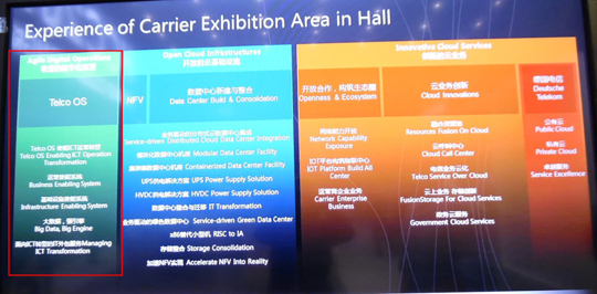 在次2015年华为云计算大会上,华为运营商业务总裁邹志磊表示“云计算在运营商转型中扮演着重要角色,是运营商推动IT从支撑系统走向生产系统和使能平台的关键技术。” 华为倡导针对业务、运营、网络的分层云化策略,利用华为Telco OS实现敏捷的运营使能,最终通过电信业务云化及为政企客户提供丰富云服务,帮助运营商在数字时代创造的独特商业价值。
